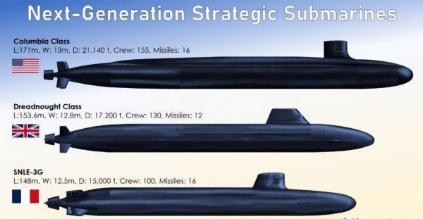 英国的无畏级战略核潜艇也在紧随其后,这型潜艇的长度为153.6米,水下排水量为17200吨,配备了130名艇员和12枚三叉戟2-D5型导弹。钢材切割工作已于2021年底开始,计划建造4艘,首艇预计到2030年代初交付使用,逐步取代前卫级潜艇。尽管英国海军的规模较小,但无畏级潜艇的吨位有所增加,导弹数量则从16枚减少到12枚,主要目的是控制成本,并优化艇员的生活空间。噪音控制依然保持在100分贝左右,建造周期相对较长,但他们注重与美国导弹的兼容性,以确保战略威慑链的完整性。