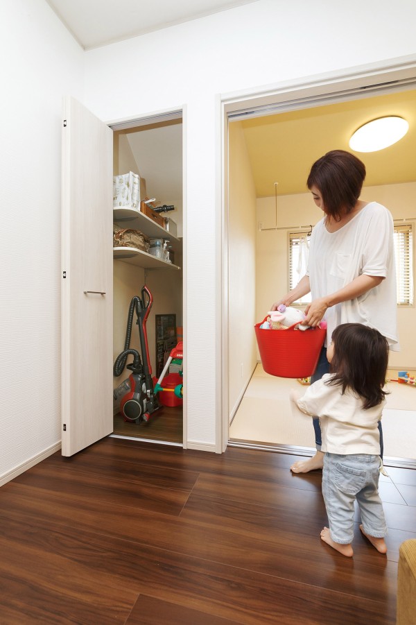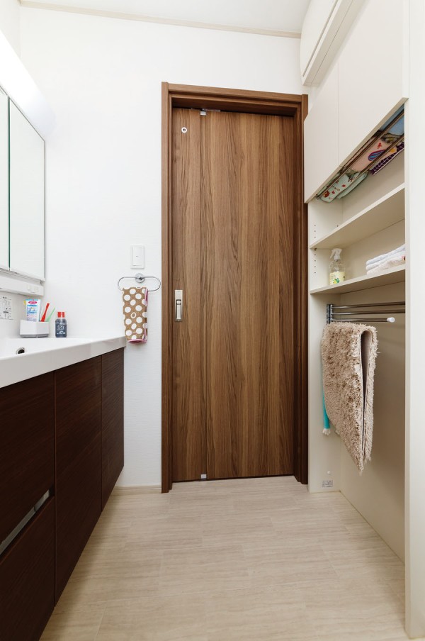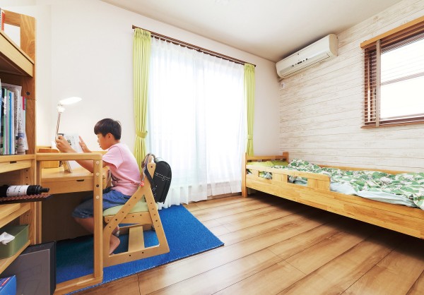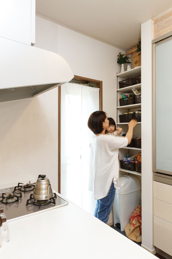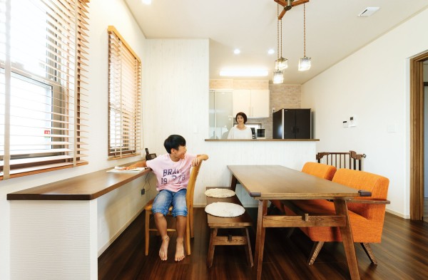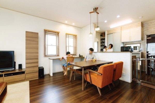 为了让夫人可以在确保孩子们认真学习的同时,专心地进行家务活动。设计在餐厅设置了一个学习角作为孩子们学习的场所。由于夫人在厨房料理家务的同时也能看到孩子的学习状况,所以夫人也能安心地做家务。