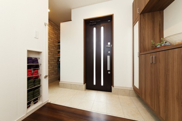 入户玄关处除了步入式衣帽间,日常用于整理和存放鞋子以及户外用品等以外。还在门厅一侧的墙面上也设置了一个拖鞋收纳柜,以此来保持玄关随时的整洁。这样一个注重设计、收纳、采光和通风的入户玄关案例,展示了如何通过精心设计的收纳解决方案来维持家庭环境的整洁和舒适。