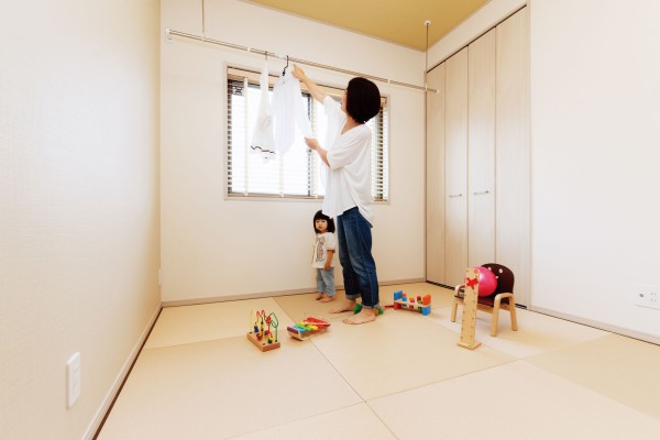 和室(多功能榻榻米空间)不仅可以作为客房和儿童游乐场,还可以在雨天或外出时迅速转变为室内晾衣空间。这个空间设计不仅考虑了传统功能,还融入了女性的细腻考虑和创意,体现了从女性日常生活需求出发的灵活多变性。