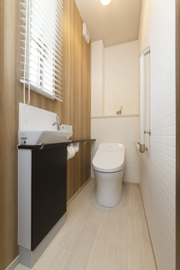 设计给卫生间赋予了独特的个性。同时,设计者还在有限的空间内巧妙地设置了带有收纳功能的洗手水龙头,使得清洁工具等物品能够被妥善收纳。这种设计不仅美观,而且实用,体现了设计师对空间利用上的精心考量。