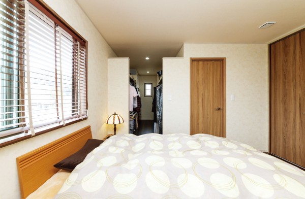 设计考虑到主卧的衣物及床上用品的收纳需求,所以在主卧室内除了墙面的壁橱以外,还在主卧室的设计中采用了步入式衣帽间,目的是为了让夫妇的衣物和床上用品能够整齐地收纳,从而保持卧室的整洁和有序。