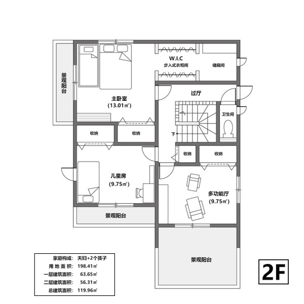 二层的景观阳台因为确保了足够宽敞的户外空间并且还装有顶棚,所以在夏天可以作为孩子们的户外活动空间,同时也可以作为户外休闲和生活空间使用,非常的方便。