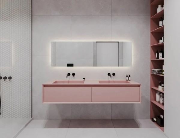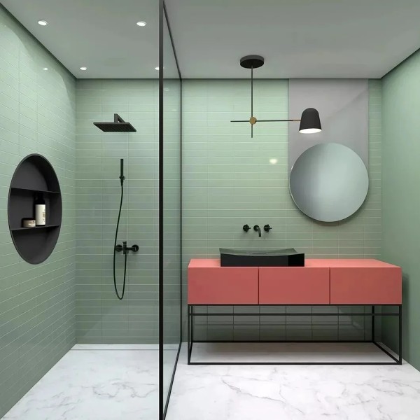 空间中如果有的墙面是不规则的形态或夹角,可通过合理的空间规划,将卫生间内的夹缝空间设置隔板,把这个夹缝区域改造成壁龛。