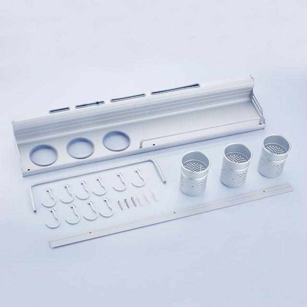 3.厨房里面工具很多,可以在墙面上安装一款这样的置物架来收纳这些物件,这款置物架是采用太空铝制成,非常的坚固耐用,而且收纳空间很大,安装起来也很简单,实用性很强。