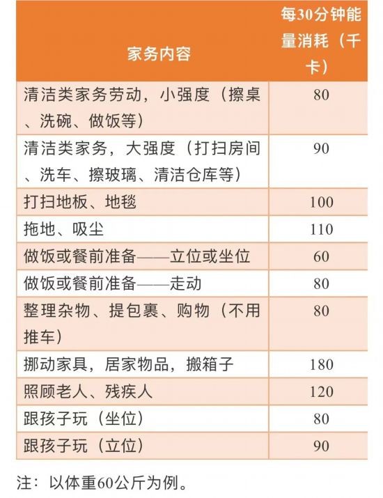 2. 做點家務:以一個體重60公斤的成年人來說,如果久坐30分鐘,他身體消耗的能量是30千卡,但是如果從事家務活動,他身體可能消耗的能量就會明顯增加(見下表)。值得注意的是,做家務在本質上並不能替代運動,因為很多家務都需要人長時間維持同一個姿勢,長此以往很容易引發肌肉勞損。因此做家務的時候也有講究,比如不要進行需要很長時間維持同一個姿勢不變的家務活動,可以做一段時間家務就舒展放鬆一下或交替做一些家務,例如在一個房間拖地,然后去晒衣服,再到另一個房間拖地。另外就是拖地或者掃地等家務可能傷腰,因此在從事這類家務時要盡可能調高手柄的位置,盡量不要彎腰增加腰部的負擔。