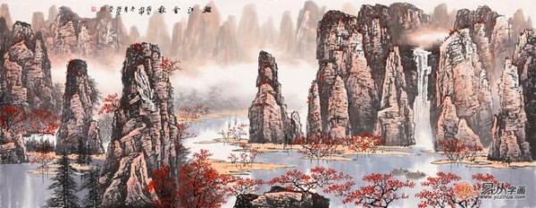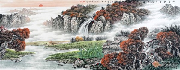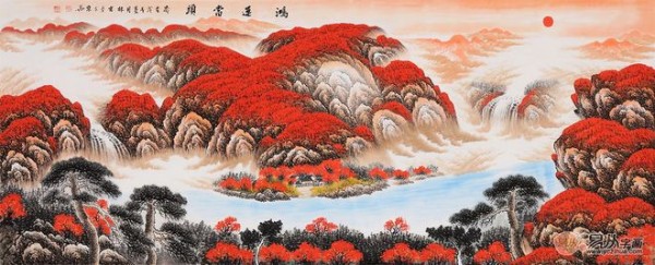 这幅作品是一幅经典的鸿运当头系列的山水画,画品紧劲连绵、循环超忽、调格逸易、意存笔先,画尽意在,给写实作品赋予了神韵!画中以极为艳丽的红色作为主要的色调,一来彰显主题景色,实为应景的刻画;二来红色有着极强的装饰性,挂于家中可带来十足的生气与活力~画中也包含着众多的美好寓意的布局,所以说是非常适合用在家居装饰上面的。不论是客厅还是书房悬挂都是非常棒的选择。