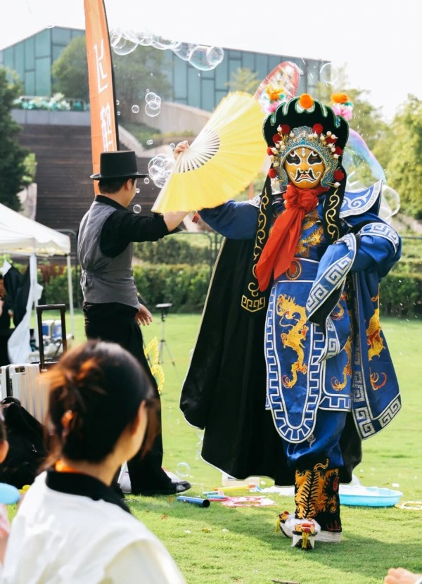 当阳光漫过文化中心露天草坪,这片区域便化作欢乐的海洋。“登陆鲜活岛”成为深受家庭欢迎的童趣空间,小丑互动让小朋友们追逐嬉戏,非遗变脸表演引得阵阵喝彩,泡泡秀表演更是让孩子们睁大了好奇的眼睛,欢声笑语在互动打卡点前定格,记录假期的温馨时刻。
