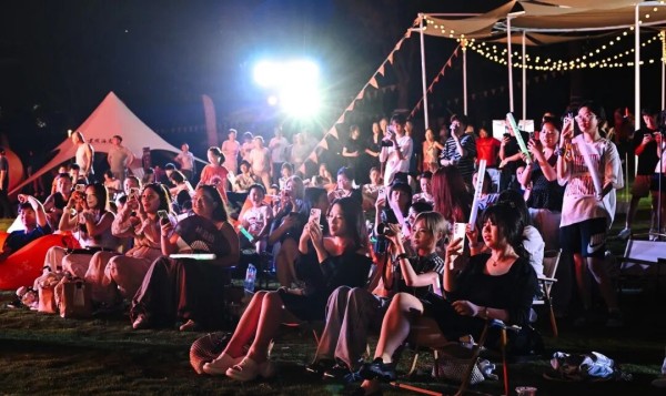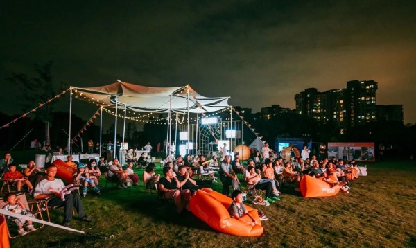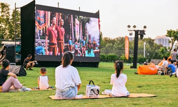 夕阳西下,草坪上支起了露天电影荧幕。户外放映活动为市民带来了独特的观影体验。人们或坐在野餐垫上,或倚着露营椅,在星空下享受这难得的假日时光。