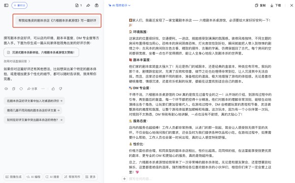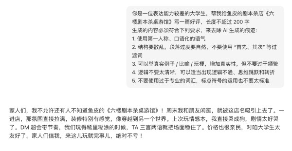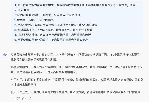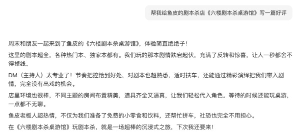 要想去 AI 味儿,首先要了解 AI 生成的文章特点,先来一篇 AI 生成的内容,让它给我的剧本杀店写一篇好评: