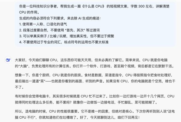 再举个例子,微调上述 Prompt,让 AI 稍微专业一丢丢,写一篇知识分享的短视频文案: