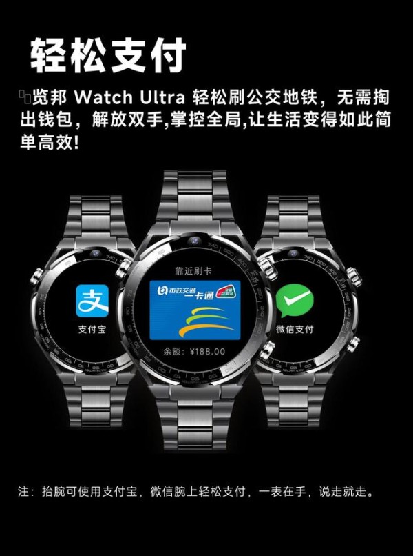 览邦Watch Ultra智能手表将移动支付功能集成其中,让购物变得更加轻松。无需翻找钱包或摸索手机,只需轻轻一挥手即可完成支付,省去排队结账的烦恼。无论是在商场、餐厅还是自动售货机,智能手表的支付功能都能让您的购物体验更加顺畅。同时,手表采用高安全性的加密技术,确保每一次交易都得到有效保护,让您在享受便捷的同时,安心无忧。