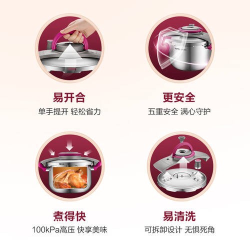 单手开合设计,让你在忙碌中也能轻松操作。 5L大容量,适合3-5人的家庭使用。 100kPa高压快煮,能够大幅度缩短烹饪时间,特别适合需要快速准备的工作日晚餐。 五重安全守护,确保使用过程中的安全性。 易清洗的设计,省去你不少清理的麻烦。 可拆卸设计,无惧死角,保持锅体的干净。 双耳手柄设计,方便取放,不占用餐桌空间。针对需要高效烹饪的家庭,苏泊尔高压锅无疑是一个优秀的选择,尤其适合忙碌的上班族和家庭主妇。