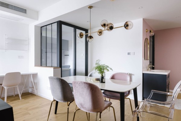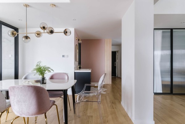 房子融多种风格为一体,整体家具搭配的十分简约大方,搭配上既体现了浪漫,也看上去十分的清幽宁静。粉色、黑色、白色、灰色构成了了各式各样的家具。巧妙的跳色手法让所有的线条都看得十分和谐流畅,居住者也能变得更加的幸福。