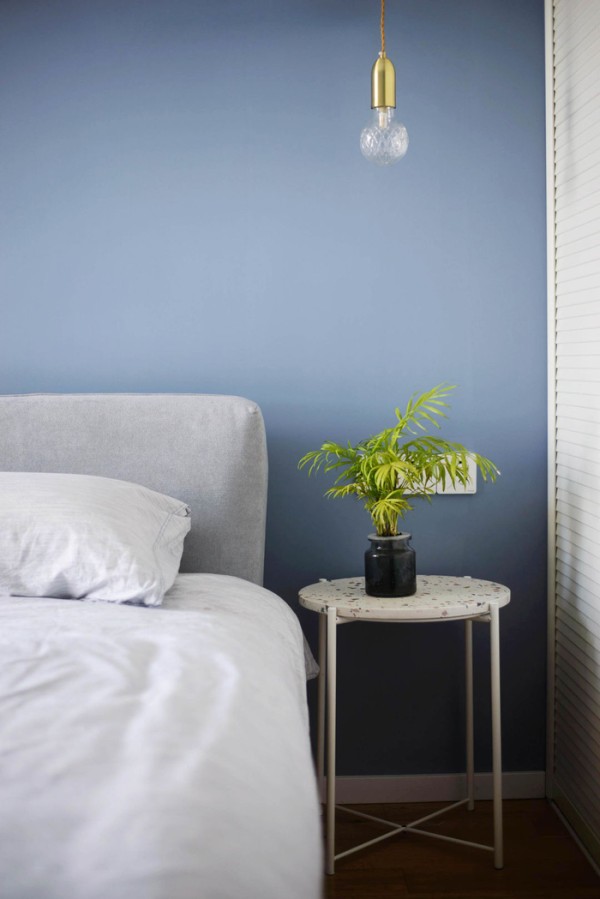 为主人十分喜欢蓝色 她认为蓝色更能够让他忘记生活上的烦恼 更好的进入睡眠 没事在卧室的装修设计中 极大的运用了蓝色元素。柔软舒适的灰色大床 干净整洁的白色柜子蓝色的背景墙,可爱的小吊灯,多种家具完美搭配 构成了卧室的清新感。