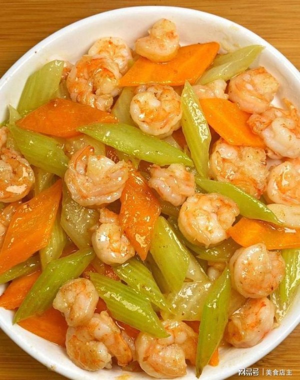 1、鲜虾去头去壳去虾线,清洗干净沥干水分。胡萝卜削掉外皮,清洗干净后切成菱形薄片。芹菜清洗干净,沥干水分后斜切成片。