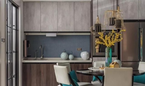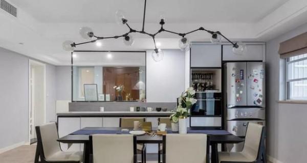 结合餐厅的装修风格设置柜子作为冰箱的“专属区”,为冰箱增加装饰性,可以在一定程度上“削弱”冰箱对餐厅整体效果带来的影响;需要注意的是将冰箱的尺寸及散热口的位置了解清楚,保证柜体能够正常使用,空间的比例协调,也不会影响散热。