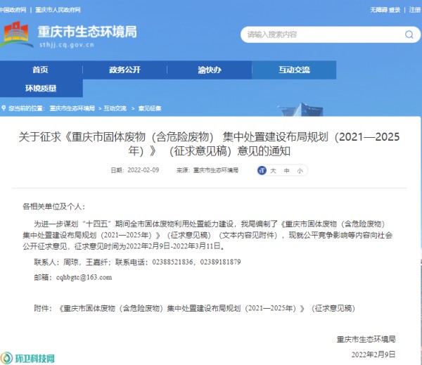 链接:关于征求《重庆市固体废物(含危险废物) 集中处置建设布局规划(2021—2025年)》 (征求意见稿)意见的通知