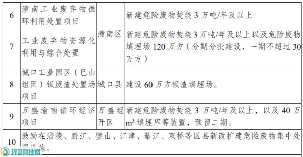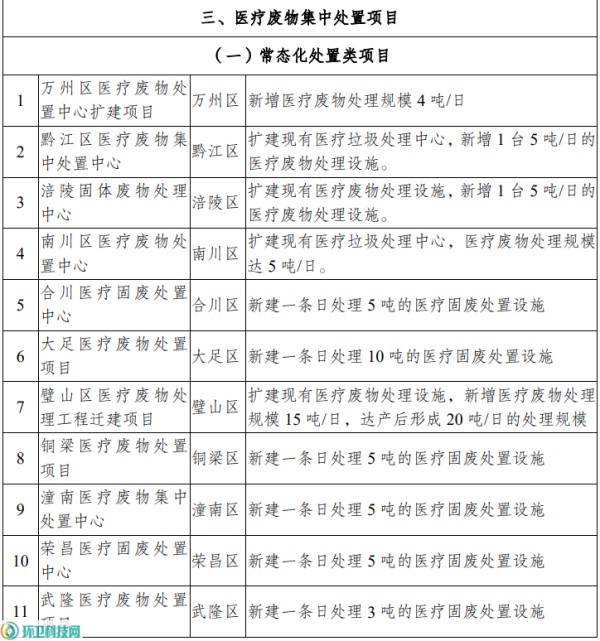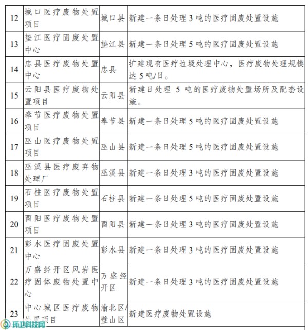 规划要求,到 2025 年,全市医疗废物处置设施更加完善,平战结合的体系基本形成,各区县(自治县)城市建成区医疗废物处置设施,医疗废物全部实现无害化处置,常规集中处置能力达 210 吨/日以上,应急处置处置能力达 150 吨/日。全市共新建渝北、荣昌、合川、大足、巫溪、武隆、酉阳、石柱、云阳、城口、万盛经开区、潼南、垫江、彭水、铜梁、奉节、巫山等 17 座医疗废物集中处置设施;改扩建璧山、涪陵、忠县、南川、黔江、万州等 6 座医疗废物集中处置设施。