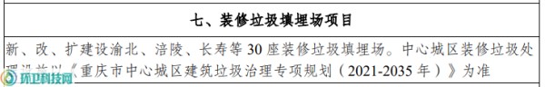 规划要求,到 2025 年,城市建筑垃圾收运率达 95%,安全处置率达 95%,中心城区建筑垃圾综合利用率达 70%,其他区县建筑垃圾综合利用率达 60%。规划在现状有条件的生活垃圾填埋场周边,增设装修垃圾填埋场,确有必要的,经论证后可另行选址新建装修垃圾填埋场。中心城区建设洛碛和接龙等装修垃圾填埋场,其他区县应同步配套 1 座装修垃圾填埋场,实现装修垃圾处理全覆盖。