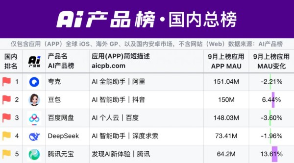 国内 C 端 AI 应用正演变为互联网公司之间的战争。AI 产品榜 9 月数据显示,月活跃用户数排名前五的 AI 应用中,除 DeepSeek 外都来自大厂旗下。其中,夸克以 1.51 亿 MAU 的数据位列第一,字节豆包、百度网盘以 1.5 亿、1.48 亿的微小差异紧追其后,腾讯元宝以 6420 万 MAU 排在第五。