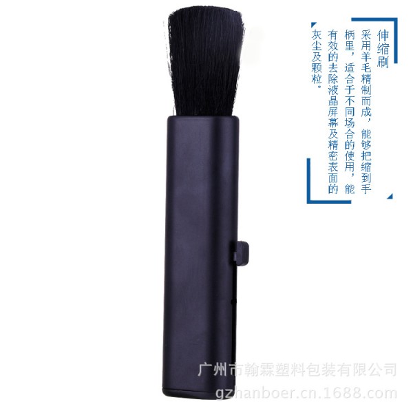 伸缩刷:采用羊毛精制而成,能够把缩到手柄里,适合于不同场合的使用,能有效的去除液晶屏幕及精密表面的灰尘及颗粒