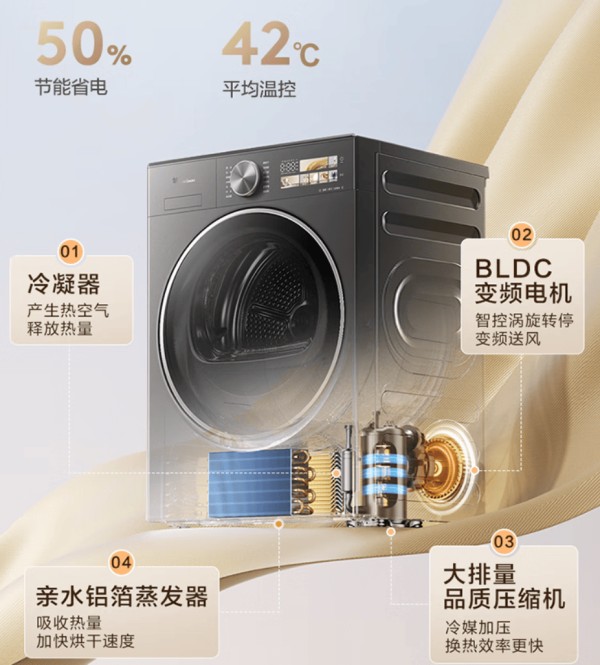 搭载变频电机+变频压缩机+变频风扇,支持42℃低温柔烘与1:1正反转防缠绕,羊毛缩水率低于0.8%,羽绒蓬松度达90%。AI智控算法实时监测湿度,避免过度烘干。