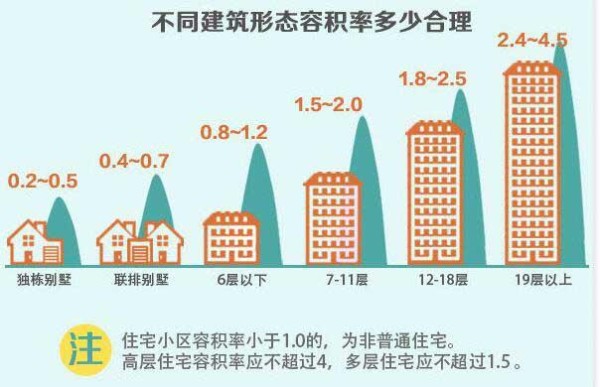 所以容积率越小,说明小区舒适度越好,绿化环境以及公共设施会相对较多,一般来说,高层住宅容积率不超过4,多层不超过1.5,别墅一般小于1.0。
