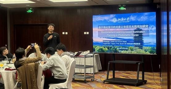 马来西亚博士生 Jun Hoong Chan(导师施柏鑫) 则带来了关于“基于强化学习的光度立体视觉光照规划”的研究进展,深度剖析了科研问题的解决方案和应用前景,赢得了现场的阵阵掌声。