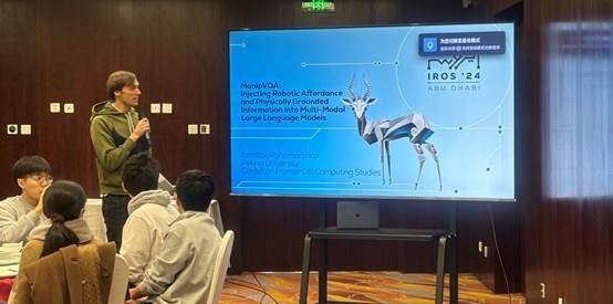 俄罗斯硕士生 Iaroslav Ponomarenko(导师董豪)展示了他的研究——“将机器人可操作性和物理基础信息注入多模态大型语言模型”。他详细讲解了研究方法和进展,同学们听得十分投入,并踊跃提问,现场讨论热烈。