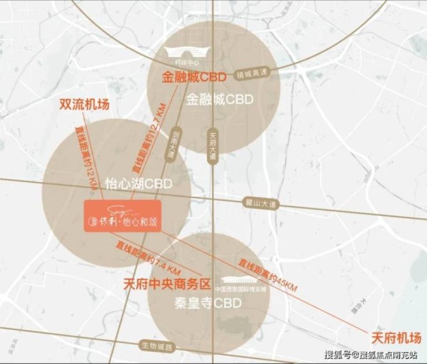 在成都向南的发展中,天府大道和剑南大道是最为两条重要的两条动脉。怡心湖的出现,恰恰在金融城CBD和秦皇寺CBD之间形成了新的一极,共同构建出一个显著的等边“黄金三角”。