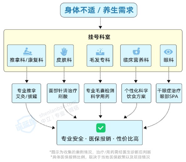 到医院挂科养生?年轻人降本增效新思路打破“只有生病才去医院”的思维,将日常健康困扰主动映射到医院科室: