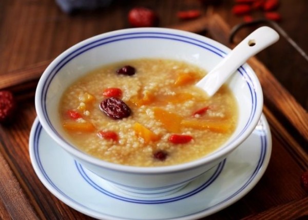 加入适量清水,大火煮开。小米淘洗后倒进锅内,搅拌均匀,再放入几颗洗净的红枣。