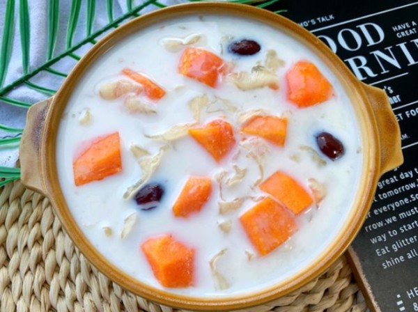处理好了撕成小朵,放进砂锅中,加入适量清水熬煮,大约半个小时后,放入冰糖、切好的木瓜、洗净的红枣。