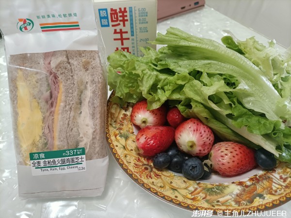 交了几次智商税后,我决定自己动手,做一些简单的餐食。牛奶、三明治、蔬菜和水果,简单清洗和加工一下,就可以成为一顿营养丰富的减脂餐。
