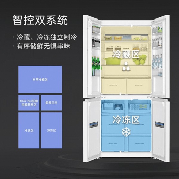 十字四开门的结构布局合理,内部空间宽敞,521升的超大容量足以满足全家人的食材储存需求。冰箱内部采用双系统设计,有效避免了食物间的串味问题,保持了食材的原汁原味。