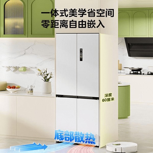 冰箱采用60cm超薄机身设计,完美融入各种厨房空间,实现真正的零嵌入,既节省空间又美观大方。十字对开四开门的设计,不仅让食材分类存储更加便捷,还大大提升了取物的便利性。底部前置散热系统,有效避免了传统冰箱两侧散热带来的空间浪费,让厨房布局更加灵活。