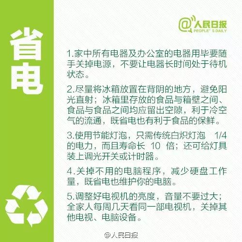 节能应当成为每个人的生活意识,一种习惯。比如:随手关灯、随手关水、随手关电视、随手关空调、随手关电脑等等。这一系列的“随手”在不经意中都会为节约能源做出贡献。