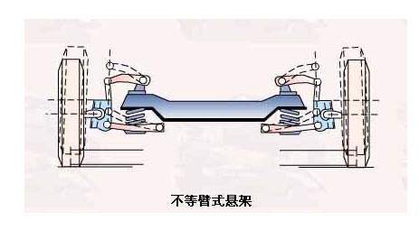 不等臂双横臂上臂比下臂短。当汽车车轮上下运动时,上臂比下臂运动弧度小。这将使轮胎上部轻微地内外移动,而底部影响很小。这种结构有利于减少轮胎磨损,提高汽车行驶平顺性和方向稳定性。