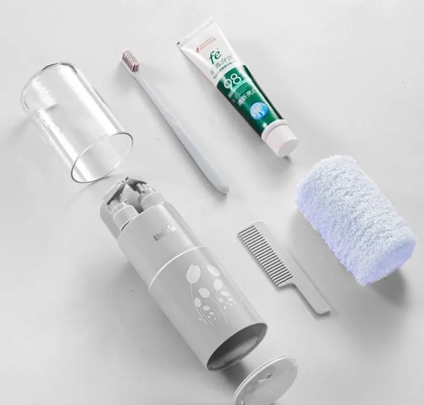 这是一款可以将毛巾、梳子、牙刷、牙膏、洗发水、沐浴乳一起装起来的多功能分装瓶。这个分装瓶只有保温杯的大小,旅行携带不占地,而且盖子可以当漱口杯使用,瓶底盖可以打开装毛巾。