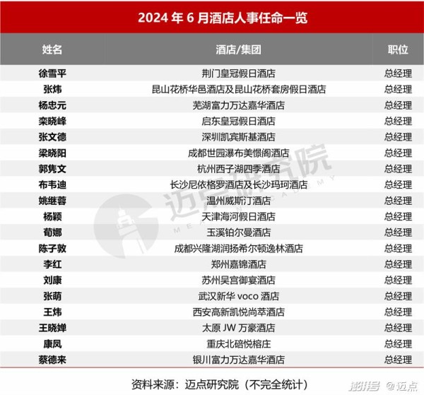 据迈点研究院不完全统计,2024年6月共有34位酒店高管履新,其中涉及希尔顿、凤悦美诺、美高梅、凯宾斯基等多个奢华、高端酒店集团及品牌。
