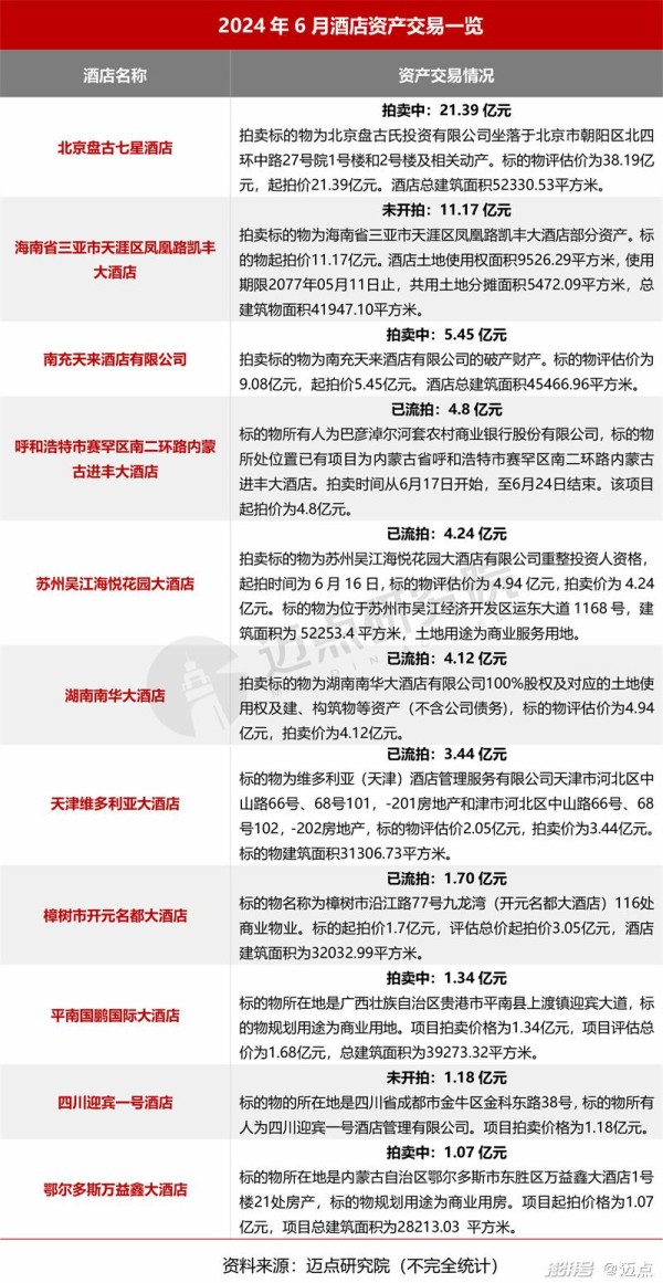 据迈点研究院不完全统计,2024年6月,共有33家酒店拍卖,其中拍卖价格在亿元以上酒店11家,拍卖价格在5000万元-1亿元酒店10家,拍卖价格5000万元以下12家,截至发稿,没有酒店项目成交。
