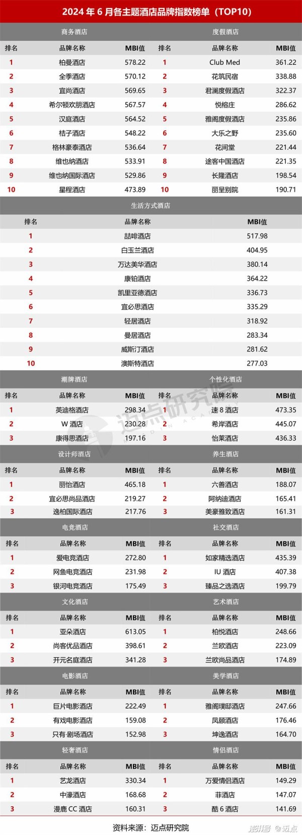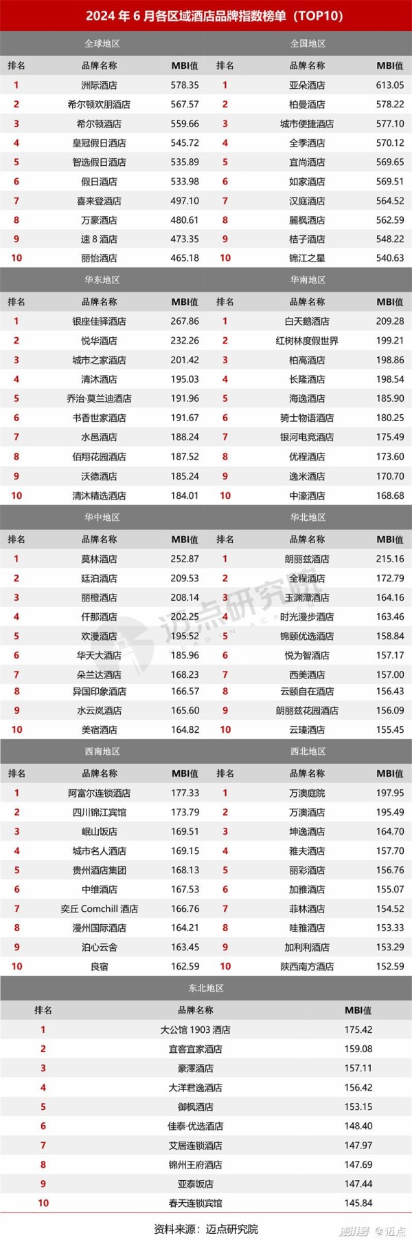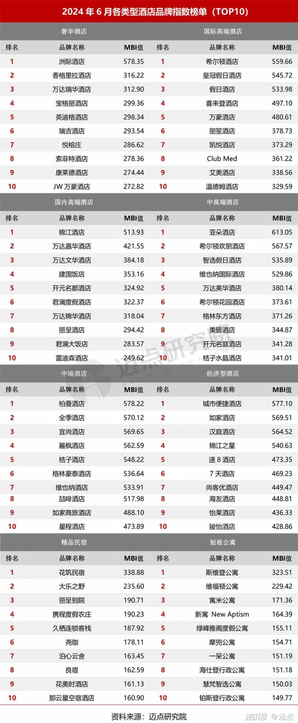 6月类型/主题/区域酒店分榜单分析:1、中高端酒店品牌将成为拉动酒店集团规模增长的重要牵引力,特别是该类酒店品牌的“千店”战略,将会被提升为战略高地。2、在无差别竞争与行业变革的双重压力下,主题酒店其独特的文化体验与个性化服务优势不再凸显,发展空间受限。加之酒店业整体复苏未达到预期,消费者需求多元化仍在加剧,因此当下主题酒店需快速适应市场变化,深化创新,强化品牌特色,以在复杂环境中寻求突破,实现可持续发展。3、随着国内大型酒店集团对沿海及经济发达区域及周边的深度驻扎与大规模开拓,如东呈对华东酒店市场的重构、华住与锦江对华中酒店市场的进军等,使该类区域未来发展前景不容小觑。