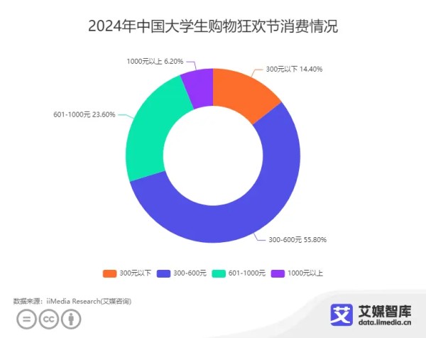 iiMedia Research(艾媒咨询)数据显示,在2024年中国大学生购物狂欢节消费情况中,14.40%消费者会选择300元以下,55.80%消费者会选择300-600元,23.60%消费者会选择601-1000元,6.20%消费者会选择1000元以上。