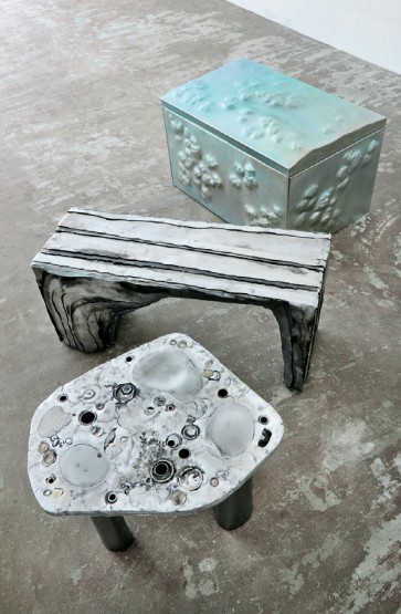 当然,新原料的“发现”也可促进新工艺的诞生。比如设 计出“奥 拉”(Ora)家具 系列的克 莱门汀·布法(Clémentine Buffa)便是在常见矿物的开采过程中,发现一些被遗忘的“次等”金属:铝土矿(bauxite)、孔雀石(malachite)和赤铁矿(hematite)。它们所拥有的独特美感和结构,也需要新的处理工艺。这样一来,这类新发现的金属也可在不久之后被量产,减少资源浪费的同时,带来新的独特设计。