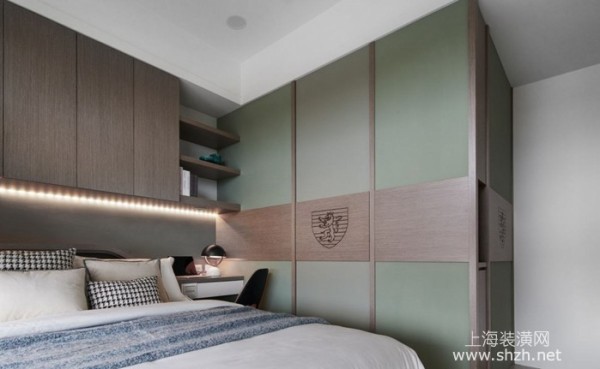 私人空间卧室的木质房门、柜体上,特别雕镂徽章,展现独特风格也让新生活与屋主过去经历有所连结。卧房延续莫兰迪色系的应用,并透过跳色方式呈现每间卧房的特色,收纳规划则运用床头、转角地带,打造充裕的储藏空间,发挥每个角落放大空间坪效。