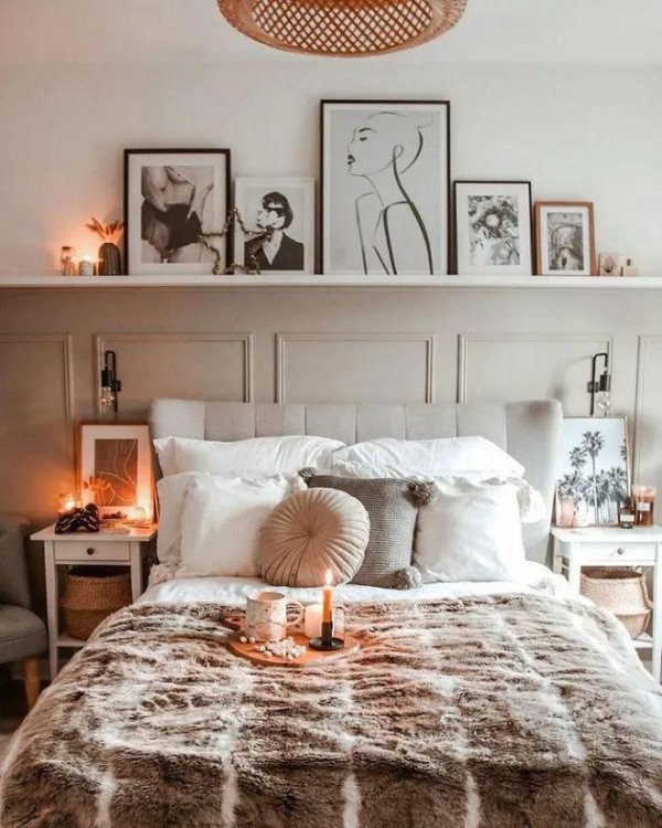 ①床头背景墙搁板。与其在背景墙挂画,不如增加书籍存储空间,睡前随手取下一本阅读。适当增加一些装裱艺术品可以让房间更有艺术氛围哦。