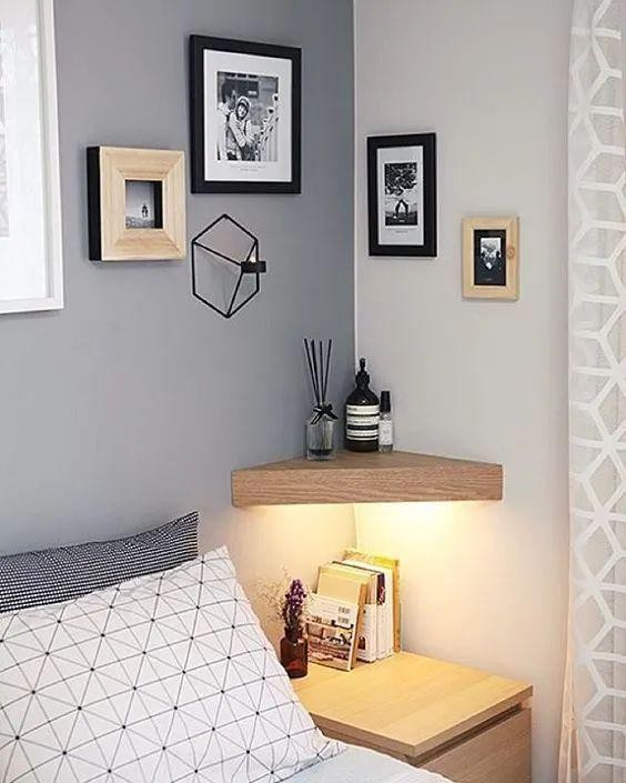 ②墙面转角搁板。极致小户型墙面空间不是很大,转角处也别放过。安装一个转角搁板用来收纳香氛、植物等小物件,有利于保持卧室的整洁度。