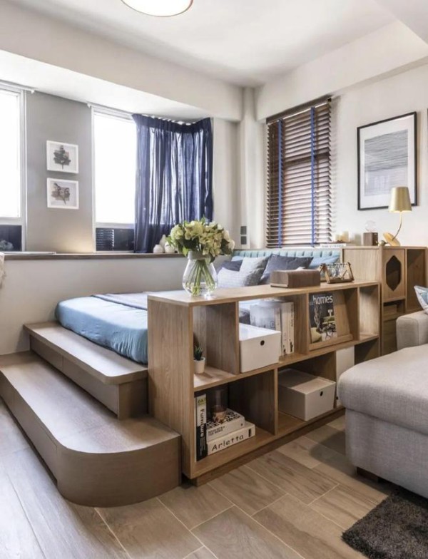 书架还可以和地台床结合设计,两侧都是开放格,无论坐沙发还是床上都很好拿取。内侧还能给猫主子安排一个窝,整体设计紧凑又美观。
