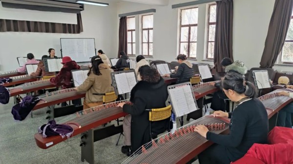 古筝教室里,学员们以优雅的仪态弹奏,全员沉浸于古筝艺术的典雅韵味之中。